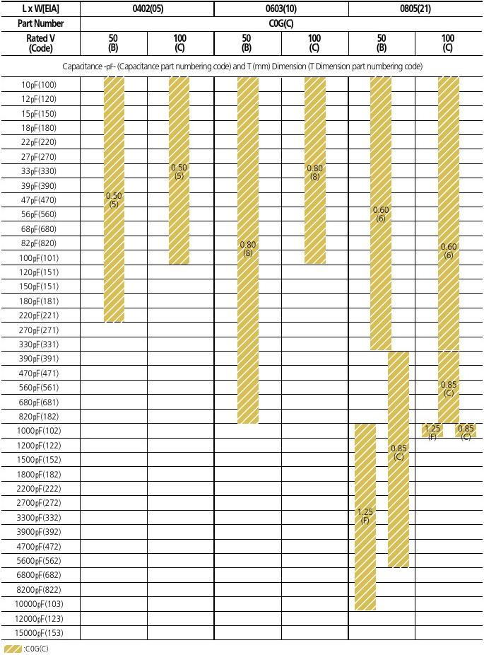 Samsung's automotive capacitor capacity is 10 pf ~ 15000 pf; Type selection charts for sizes 0402, 0603 and 0805 are as follows