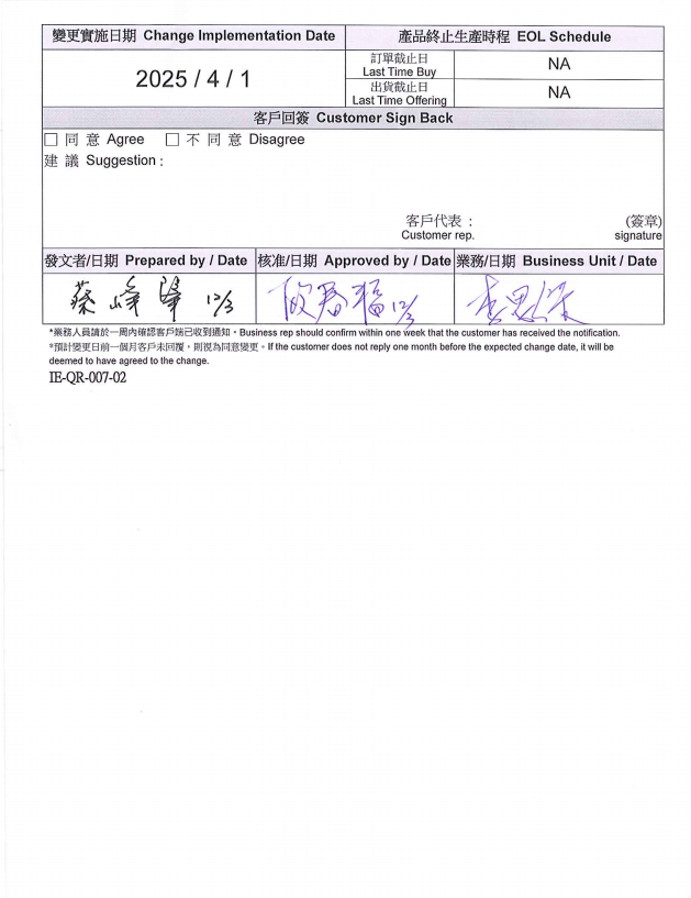 The reason for the change is that due to poor character width and line diameter matching in the old code design of Tian'er, there is a high risk of appearance defects such as font diffusion, blurring, dot pattern, filling, etc. during code printing. After multiple adjustments to the trial production process conditions, it is still unable to effectively improve the defect rate. Therefore, Tian'er has made a comprehensive change to the font to improve the appearance yield of Tian'er products and reduce the probability of customers' AOI appearance judgment NG after PCB placement and furnace due to code defects.