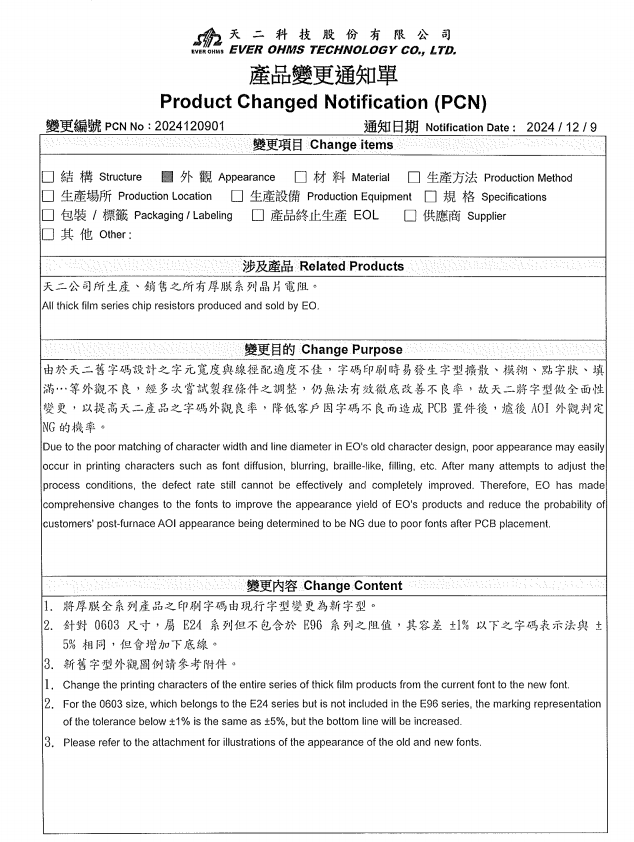 The change order number is document number 2024120901, and the silk screen change for thick film resistor products applies to all thick film chip resistor products of Tian'er Technology (ever ohms).