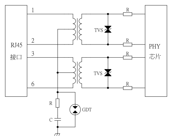 The TVS with small volume and low junction capacitance is used to absorb the differential mode energy at the back of the network transformer. The TVS has fast response time and can protect against static electricity.
