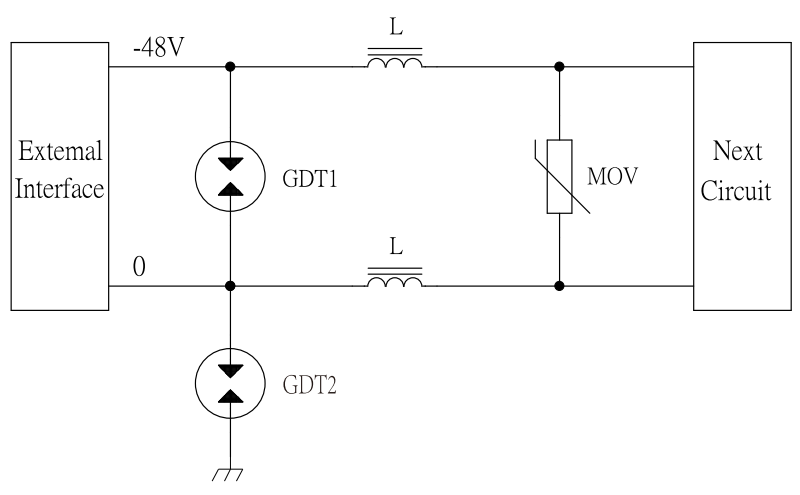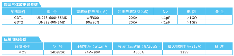 The front stage uses Surface Mount Gas Discharge Tubes (GDT1) featuring large discharge capacity, strong follow current interruption capability and low residual voltage