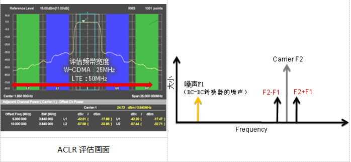 例如,在射频信号完整性评估中,一般的ACLR评估频率带宽,以载波频率 (F2) 为中心,W-CDMA为25MHz,LTE则为50MHz。如果只考虑单侧,根据载波频率 (F2) 评估,W-CDMA的带宽将为12.5MHz,LTE的带宽将为25MHz。因此,在ACLR测试中,对于W-CDMA来说,频率在12.5MHz以下的噪声 (F1) 对射频信号完整性有影响; 对LTE来说,频率在25MHz以下的噪声对射频信号完整性有影响。对低频带的噪声来说,DC-DC转换器的开关噪声 (一般来说,PA用DC-DC转换器的开关频率为2~10MHz) 为主要原因。DC-DC转换器的开关噪声对射频信号完整性有影响。要消除PA电源线的噪声,必须抑制DC-DC转换器开关噪声的电平。