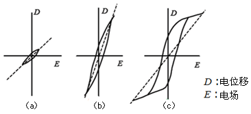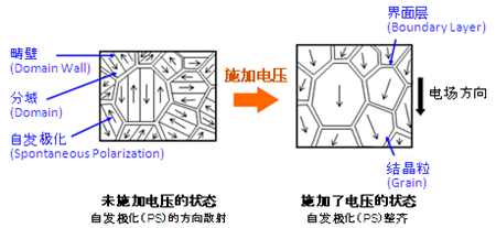 如上所述,铁电体陶瓷的结晶粒(Grain)有分域(Domain),各个自发极化(Ps)的方向是随机的,整体上相当于无极化的状态。在此之上施加电场(E)时,电场方向上产生极化,达到饱和值。在这种状态下即使去除电场,极化方向也不会回到原来无序随机的状态,多少会停留在极化时的状态上,形成残留极化,在外部显现。为了让这种残留极化归零,需要反方向的电场。逆电场进一步增强时会发生极化反转,向相反方向进行极化。类似这样的因外部电场而引起的铁电体的极化动作如图4的D-E历史曲线(磁滞曲线)。