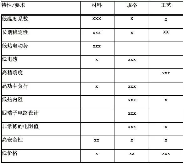理想的完全不受以上参数影响的电流检测电阻是不存在的,那么实际的电阻可通过下文表格中所列的特性参数,例如电阻温度系数、长期稳定性、热电动势、功率负荷、电感、线性度等来表述。