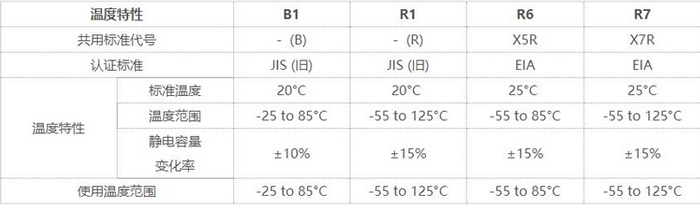 村田贴片电容的温度特性有两种:JIS与EIA,具体参数如下表表示