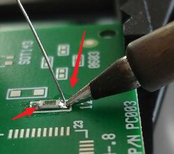 步骤二、在用焊笔上贴片电阻焊盘添加差不多的助焊剂;