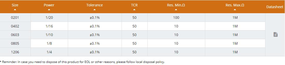 (图二是KOA电阻器的参数对照表,其中koa超精密型号的参数值精密。)